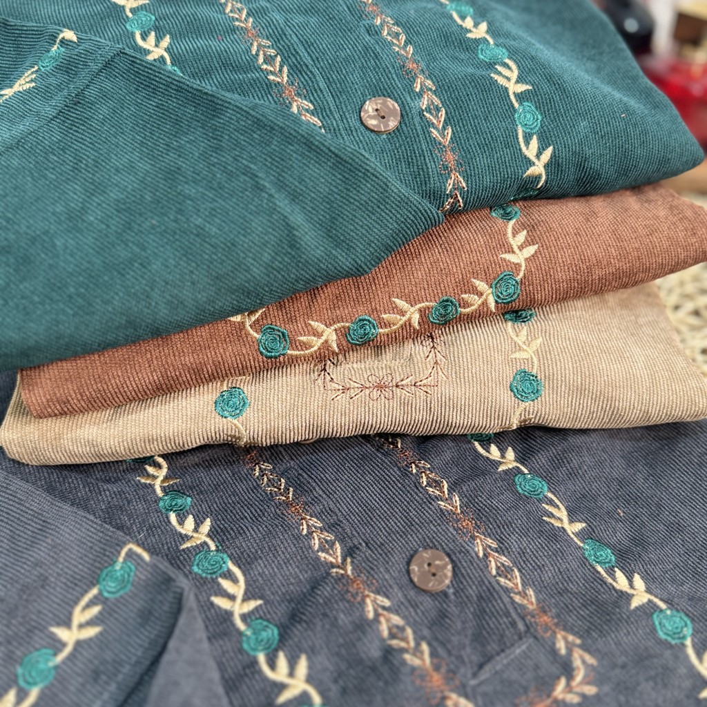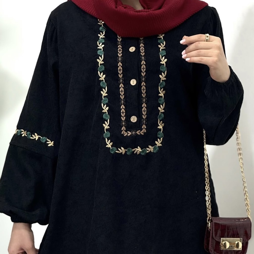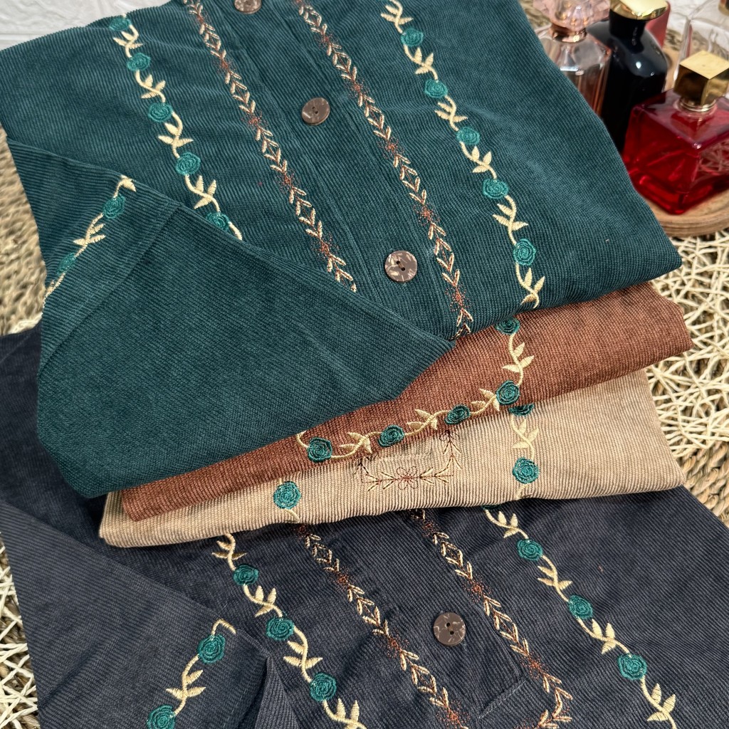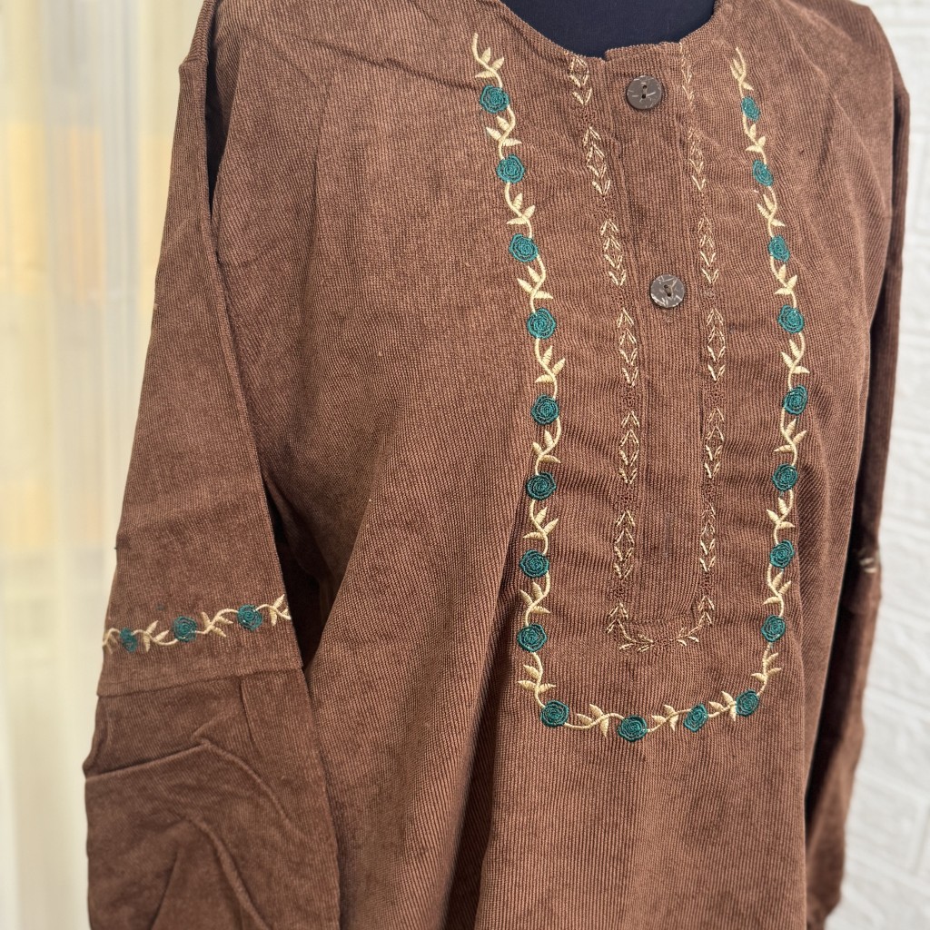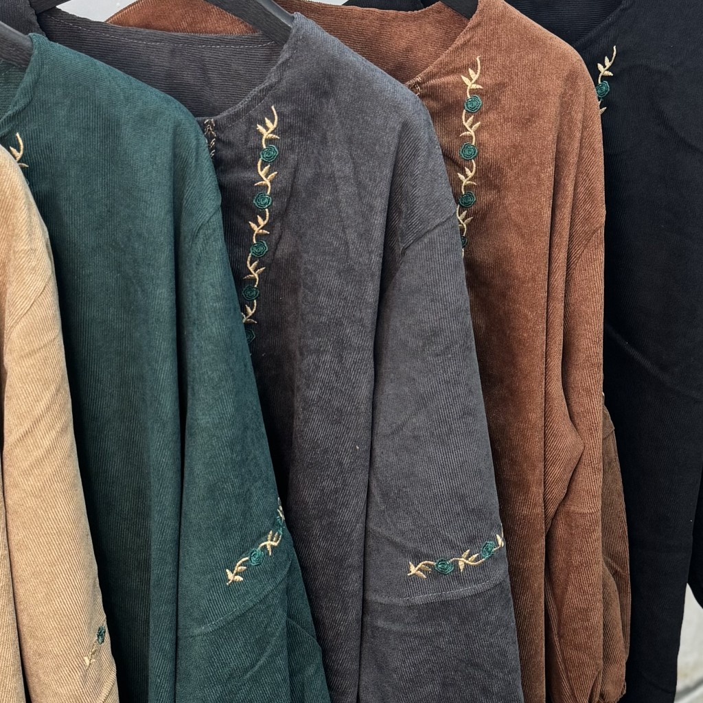 شومیزی فریسایز با جنس مخمل کبریتی و گلدوزی ظریف دور یقه و آستین. دارای یقه سهدکمه، آستین کشدار و تنخور راحت. مناسب استفاده روزمره و استایلهای شیک پاییزی و زمستانی